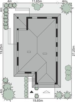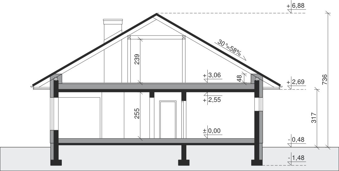 Ściany zewnętrzne: pustak 25 cm, styropian 20 cm. Ściany nośne: pustak 25 cm. Strop: monolityczny żelbetowy. Dach: kąt nachylenia 30°, pokrycie - dachówka ceramiczna lub betonowa.