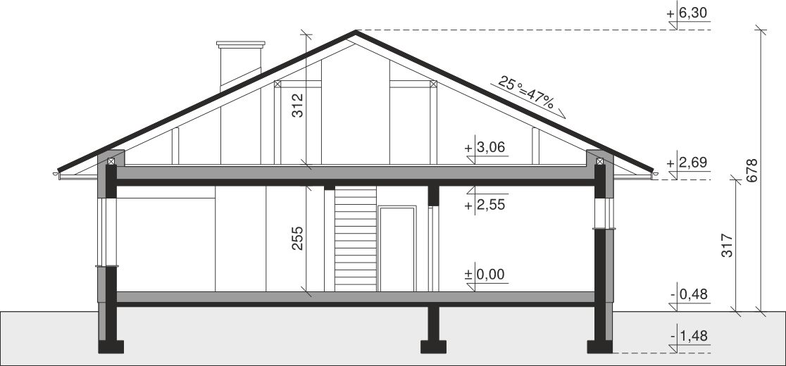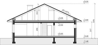 Ściany zewnętrzne: pustak 25 cm, styropian 20 cm. Ściany nośne: pustak 25 cm. Strop: monolityczny żelbetowy. Dach: kąt nachylenia 25°, pokrycie - dachówka ceramiczna lub betonowa.