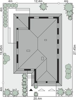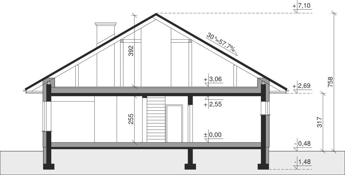 Ściany zewnętrzne: pustak 25 cm, styropian 20 cm. Ściany nośne: pustak 25 cm. Strop: monolityczny żelbetowy. Dach: kąt nachylenia 30°, pokrycie - dachówka ceramiczna lub betonowa.
