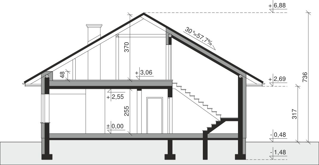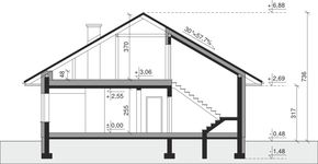 Ściany zewnętrzne: pustak 25 cm, styropian 20 cm. Ściany nośne: pustak 25 cm. Strop: monolityczny żelbetowy. Dach: kąt nachylenia 30°, pokrycie - dachówka ceramiczna lub betonowa.