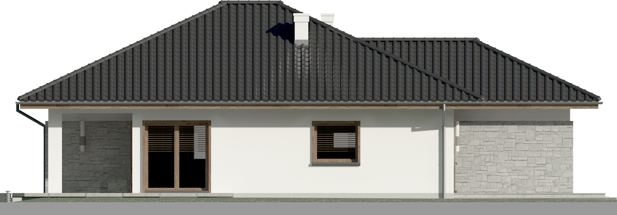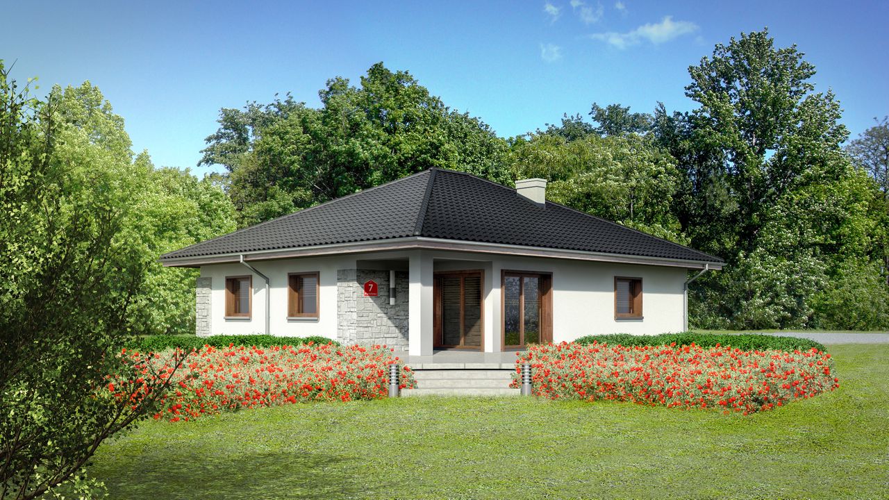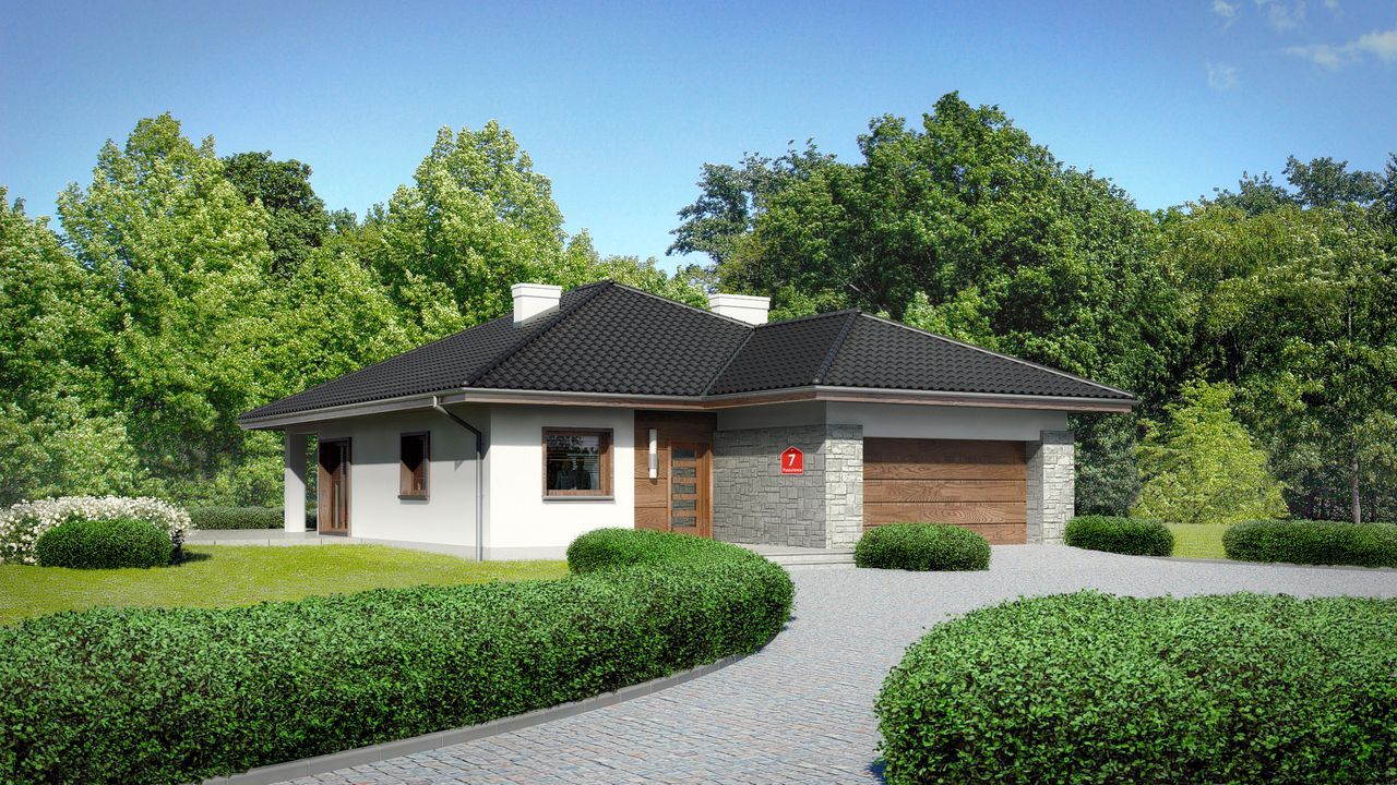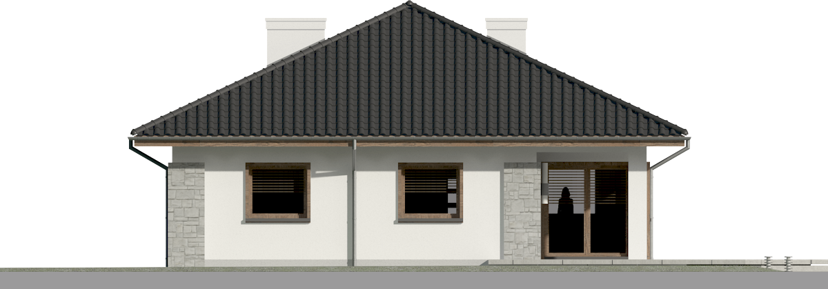 Graficzne opracowanie rzutów poglądowych widocznych na karcie projektu zostało wykonane przez Extradom.pl. Prezentowane przez Extradom.pl wizualizacje wykonane zostały przez autora projektu i należy poczytywać je jedynie za przykład i propozycję wykończenia, wizję architektoniczną autora projektu. Ostateczne wykończenie budynku może nastąpić na wiele sposobów. Szczegółowe rozwiązania zastosowane w oferowanej dokumentacji - w tym również ilość, lokalizacje i wygląd okien, drzwi, kominów - mogą w niewielkim stopniu różnić się od prezentowanej wizualizacji budynku.