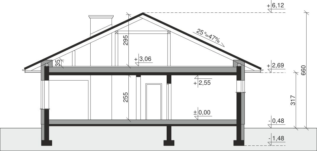 Ściany zewnętrzne: pustak 25 cm, styropian 20 cm. Ściany nośne: pustak 25 cm. Strop: monolityczny żelbetowy. Dach: kąt nachylenia 25°, pokrycie - dachówka ceramiczna lub betonowa. Instalacja solarna.