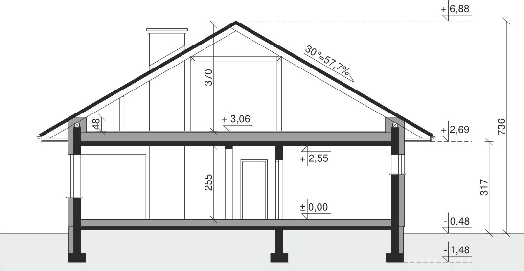 Ściany zewnętrzne: pustak 25 cm, styropian 20 cm. Ściany nośne: pustak 25 cm. Strop: monolityczny żelbetowy. Dach: kąt nachylenia 30°, pokrycie - dachówka ceramiczna lub betonowa. Instalacja solarna.