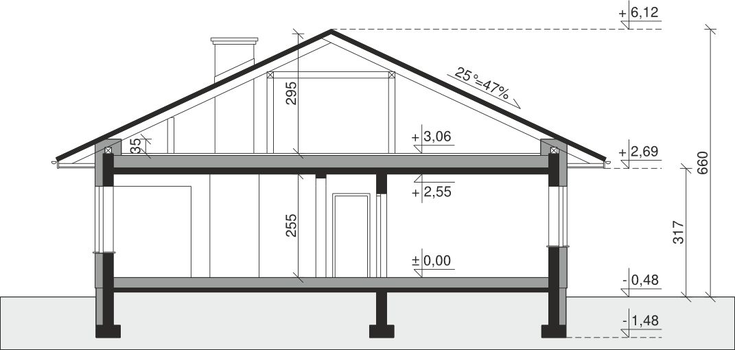 Ściany zewnętrzne: pustak 25 cm, styropian 20 cm. Ściany nośne: pustak 25 cm. Strop: monolityczny żelbetowy. Dach: kąt nachylenia 25°, pokrycie - dachówka ceramiczna lub betonowa. Instalacja solarna.