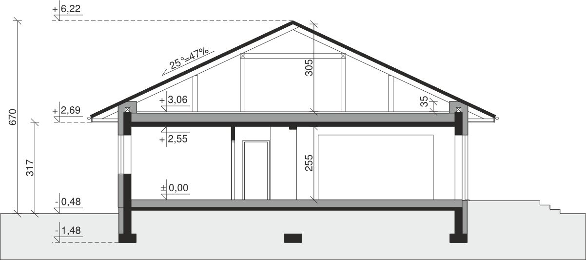 Ściany zewnętrzne: pustak 25 cm, styropian 20 cm. Ściany nośne: pustak 25 cm. Strop: monolityczny żelbetowy. Dach: kąt nachylenia 25°, pokrycie - dachówka ceramiczna lub betonowa.