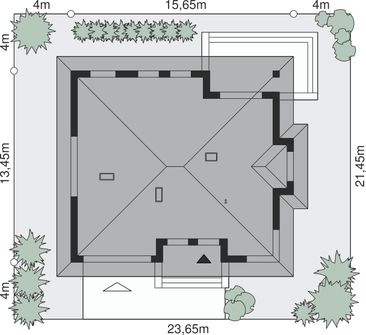 Ściany zewnętrzne: pustak 25 cm, styropian 20 cm. Ściany nośne: pustak 25 cm. Strop: monolityczny żelbetowy. Dach: kąt nachylenia 25°, pokrycie - dachówka ceramiczna lub betonowa. Instalacja solarna.