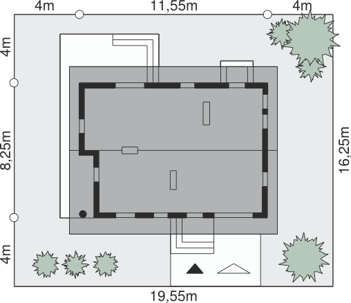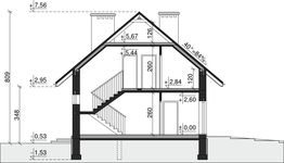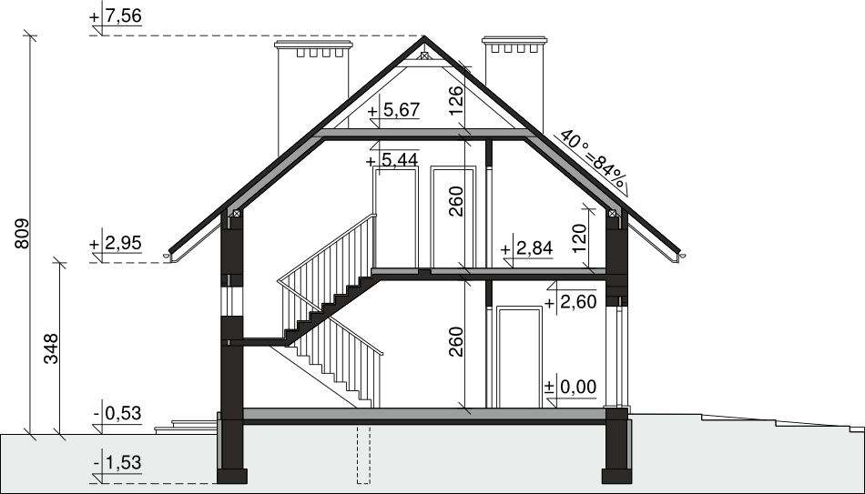 Ściany zewnętrzne: pustak 44 cm. Ściany nośne: pustak 25 cm. Strop: monolityczny żelbetowy. Dach: kąt nachylenia 40°, pokrycie - dachówka ceramiczna lub betonowa.