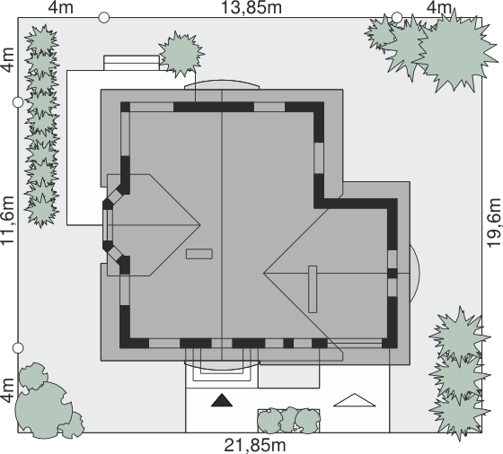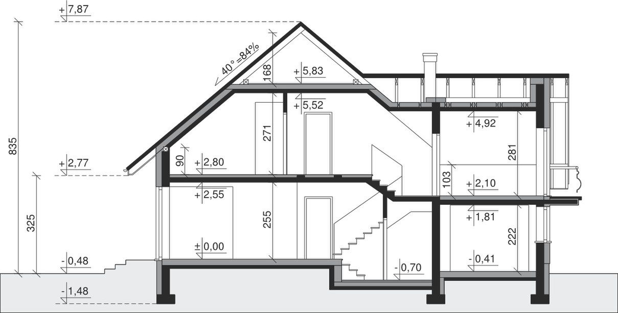 Ściany zewnętrzne: pustak 25 cm, styropian 20 cm. Ściany nośne: pustak 25 cm. Strop: monolityczny żelbetowy. Dach: kąt nachylenia 40°, pokrycie - dachówka ceramiczna lub betonowa.
