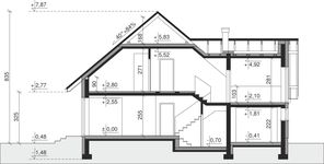 Ściany zewnętrzne: pustak 25 cm, styropian 20 cm. Ściany nośne: pustak 25 cm. Strop: monolityczny żelbetowy. Dach: kąt nachylenia 40°, pokrycie - dachówka ceramiczna lub betonowa. Instalacja solarna.