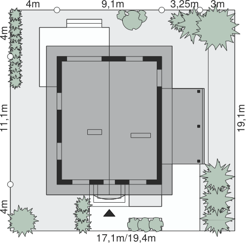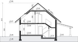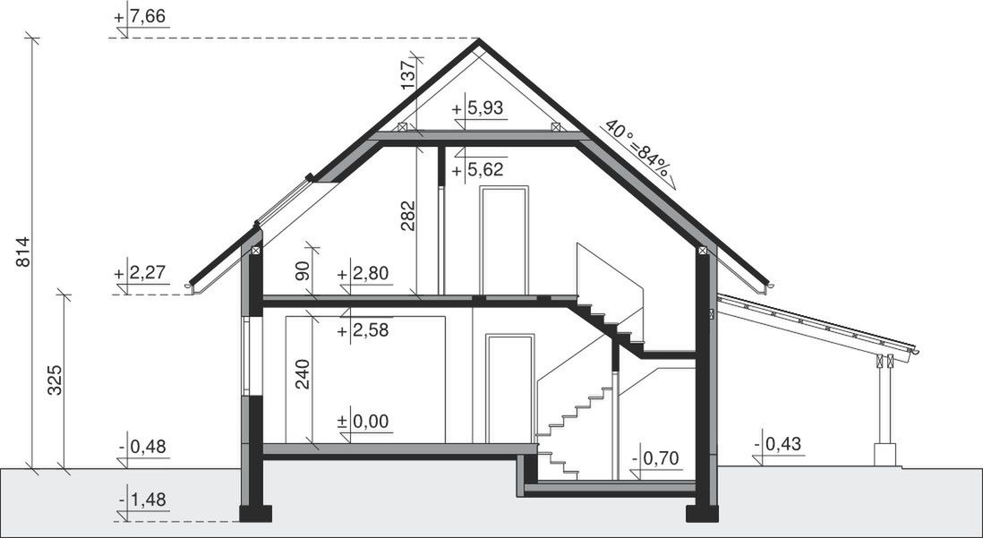 Ściany zewnętrzne: pustak 25 cm, styropian 20 cm. Ściany nośne: pustak 25 cm. Strop: monolityczny żelbetowy. Dach: kąt nachylenia 40°, pokrycie - dachówka ceramiczna lub betonowa.