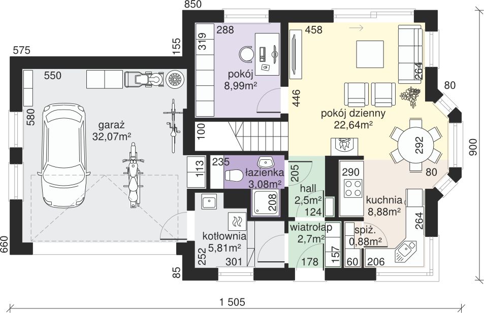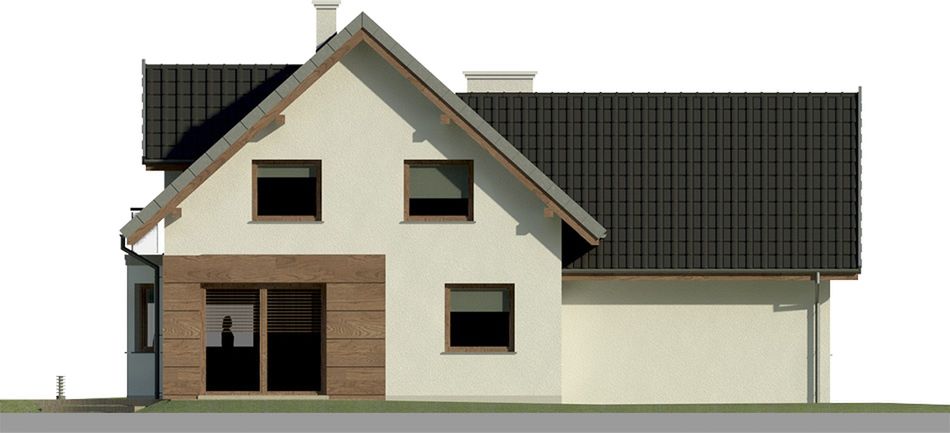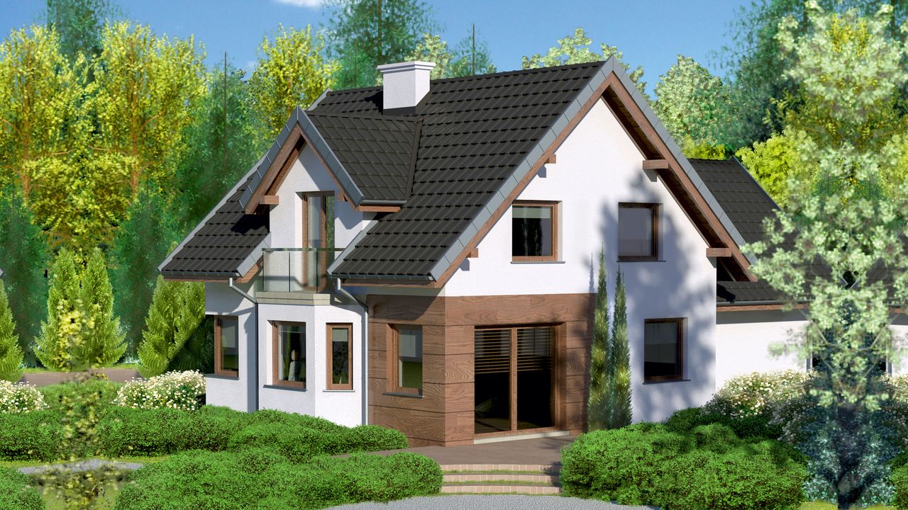Graficzne opracowanie rzutów poglądowych widocznych na karcie projektu zostało wykonane przez Extradom.pl. Prezentowane przez Extradom.pl wizualizacje wykonane zostały przez autora projektu i należy poczytywać je jedynie za przykład i propozycję wykończenia, wizję architektoniczną autora projektu. Ostateczne wykończenie budynku może nastąpić na wiele sposobów. Szczegółowe rozwiązania zastosowane w oferowanej dokumentacji - w tym również ilość, lokalizacje i wygląd okien, drzwi, kominów - mogą w niewielkim stopniu różnić się od prezentowanej wizualizacji budynku.