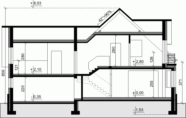 Ściany zewnętrzne: pustak 25 cm, styropian 15 cm. Ściany nośne: pustak 25 cm. Strop: monolityczny żelbetowy. Dach: kąt nachylenia 42°, pokrycie - dachówka ceramiczna lub betonowa.