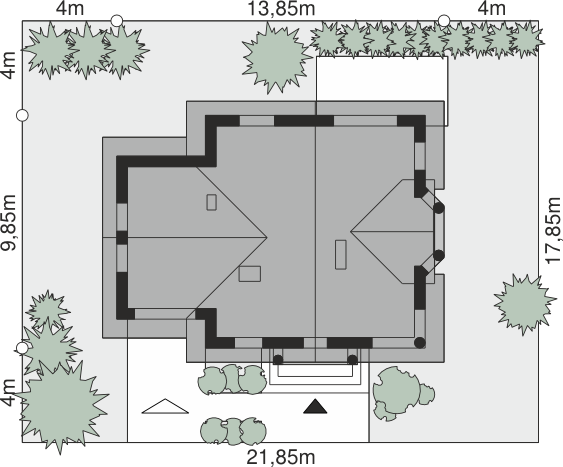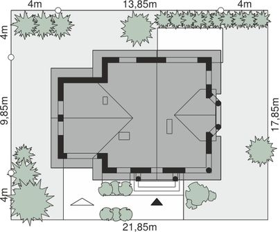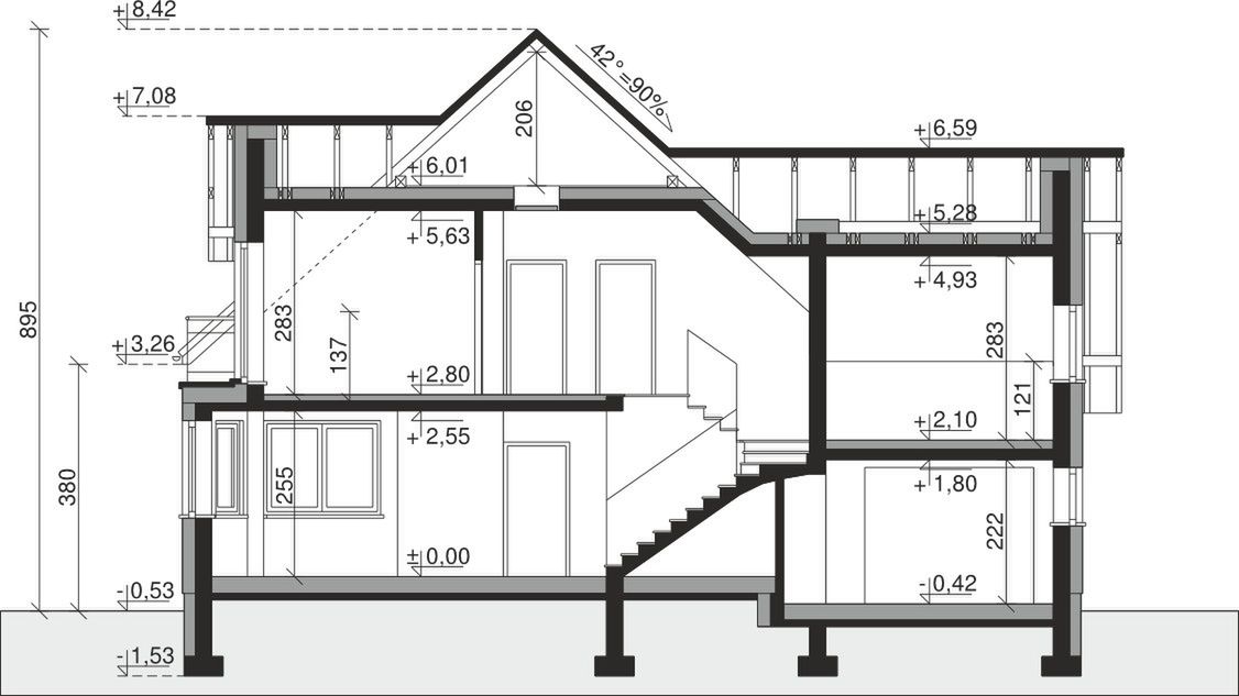 Ściany zewnętrzne: pustak 25 cm, styropian 20 cm. Ściany nośne: pustak 25 cm. Strop: monolityczny żelbetowy. Dach: kąt nachylenia 42°, pokrycie - dachówka ceramiczna lub betonowa.