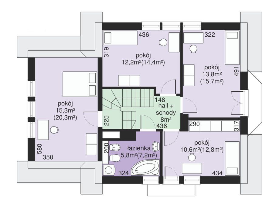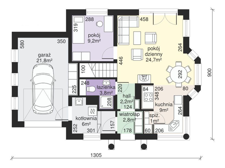Graficzne opracowanie rzutów poglądowych widocznych na karcie projektu zostało wykonane przez Extradom.pl. Prezentowane przez Extradom.pl wizualizacje wykonane zostały przez autora projektu i należy poczytywać je jedynie za przykład i propozycję wykończenia, wizję architektoniczną autora projektu. Ostateczne wykończenie budynku może nastąpić na wiele sposobów. Szczegółowe rozwiązania zastosowane w oferowanej dokumentacji - w tym również ilość, lokalizacje i wygląd okien, drzwi, kominów - mogą w niewielkim stopniu różnić się od prezentowanej wizualizacji budynku.