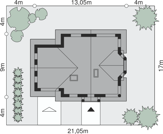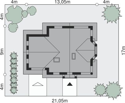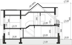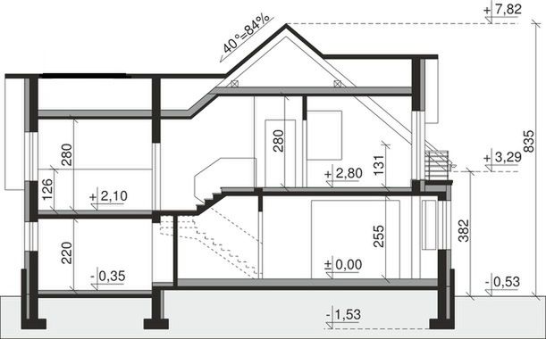 Ściany zewnętrzne: pustak 25 cm, styropian 15 cm. Ściany nośne: pustak 25 cm. Strop: monolityczny żelbetowy. Dach: kąt nachylenia 40°, pokrycie - dachówka ceramiczna lub betonowa.