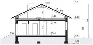 Ściany zewnętrzne: pustak 25 cm, styropian 15 cm. Ściany nośne: pustak 25 cm. Strop: monolityczny żelbetowy. Dach: kąt nachylenia 25°, pokrycie - dachówka ceramiczna lub betonowa.