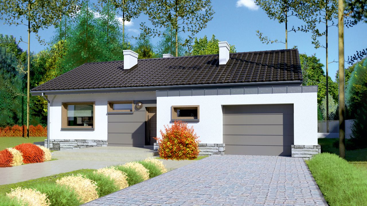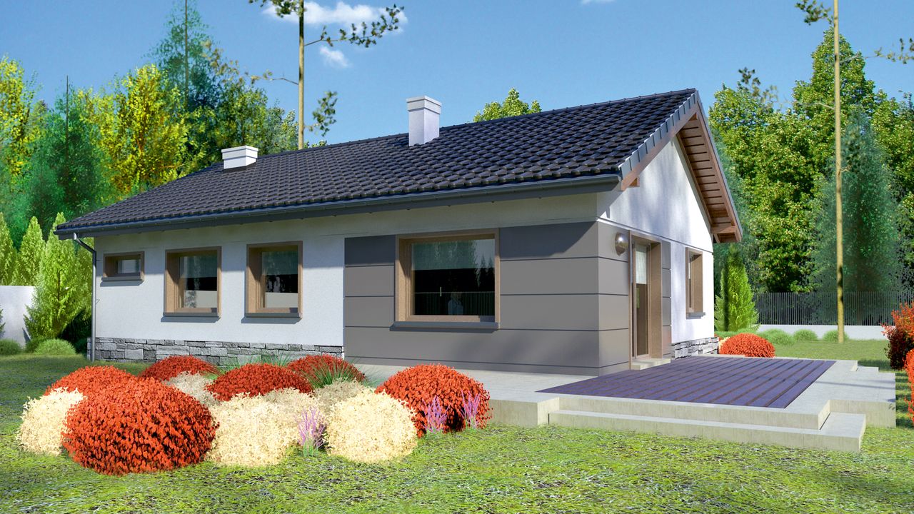 Graficzne opracowanie rzutów poglądowych widocznych na karcie projektu zostało wykonane przez Extradom.pl. Prezentowane przez Extradom.pl wizualizacje wykonane zostały przez autora projektu i należy poczytywać je jedynie za przykład i propozycję wykończenia, wizję architektoniczną autora projektu. Ostateczne wykończenie budynku może nastąpić na wiele sposobów. Szczegółowe rozwiązania zastosowane w oferowanej dokumentacji - w tym również ilość, lokalizacje i wygląd okien, drzwi, kominów - mogą w niewielkim stopniu różnić się od prezentowanej wizualizacji budynku.