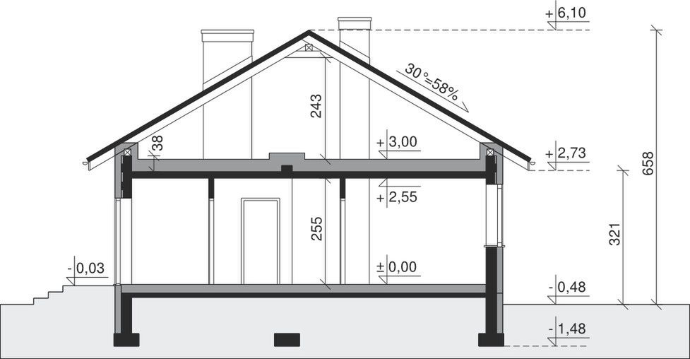 Ściany zewnętrzne: pustak 25 cm, styropian 15 cm. Ściany nośne: pustak 25 cm. Strop: monolityczny żelbetowy. Dach: kąt nachylenia 30°, pokrycie - dachówka ceramiczna lub betonowa.
