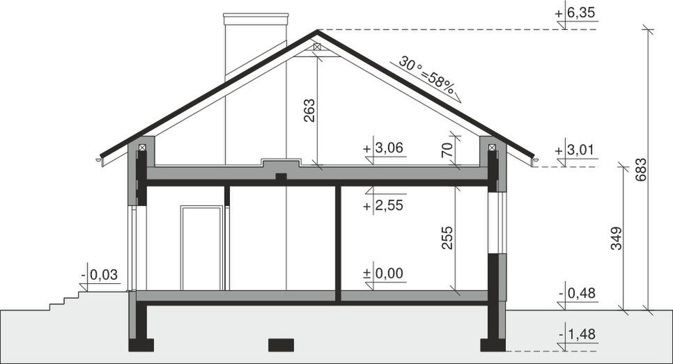 Ściany zewnętrzne: pustak 25 cm, styropian 20 cm. Ściany nośne: pustak 25 cm. Strop: monolityczny żelbetowy. Dach: kąt nachylenia 30°, pokrycie - dachówka ceramiczna lub betonowa. Instalacja solarna.