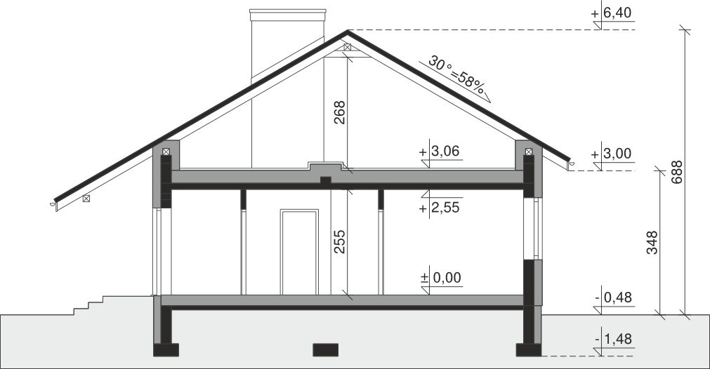 Ściany zewnętrzne: pustak 25 cm, styropian 20 cm. Ściany nośne: pustak 25 cm. Strop: monolityczny żelbetowy. Dach: kąt nachylenia 30°, pokrycie - dachówka ceramiczna lub betonowa. Instalacja solarna.