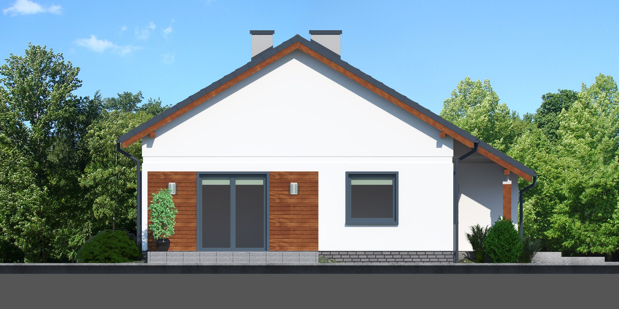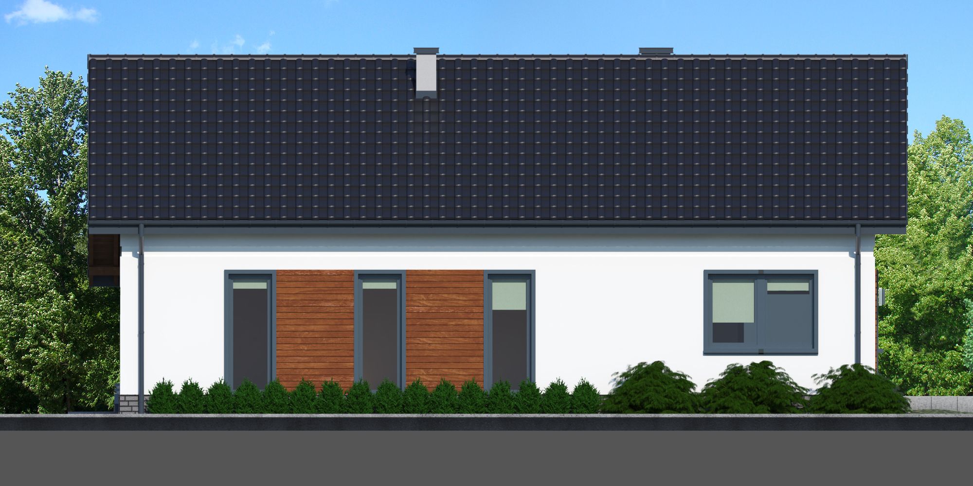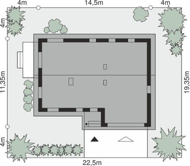 Graficzne opracowanie rzutów poglądowych widocznych na karcie projektu zostało wykonane przez Extradom.pl. Prezentowane przez Extradom.pl wizualizacje wykonane zostały przez autora projektu i należy poczytywać je jedynie za przykład i propozycję wykończenia, wizję architektoniczną autora projektu. Ostateczne wykończenie budynku może nastąpić na wiele sposobów. Szczegółowe rozwiązania zastosowane w oferowanej dokumentacji - w tym również ilość, lokalizacje i wygląd okien, drzwi, kominów - mogą w niewielkim stopniu różnić się od prezentowanej wizualizacji budynku.