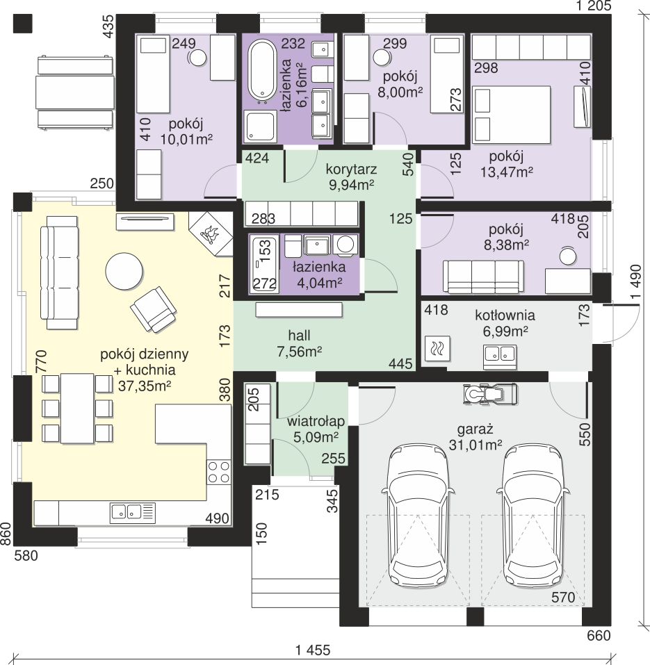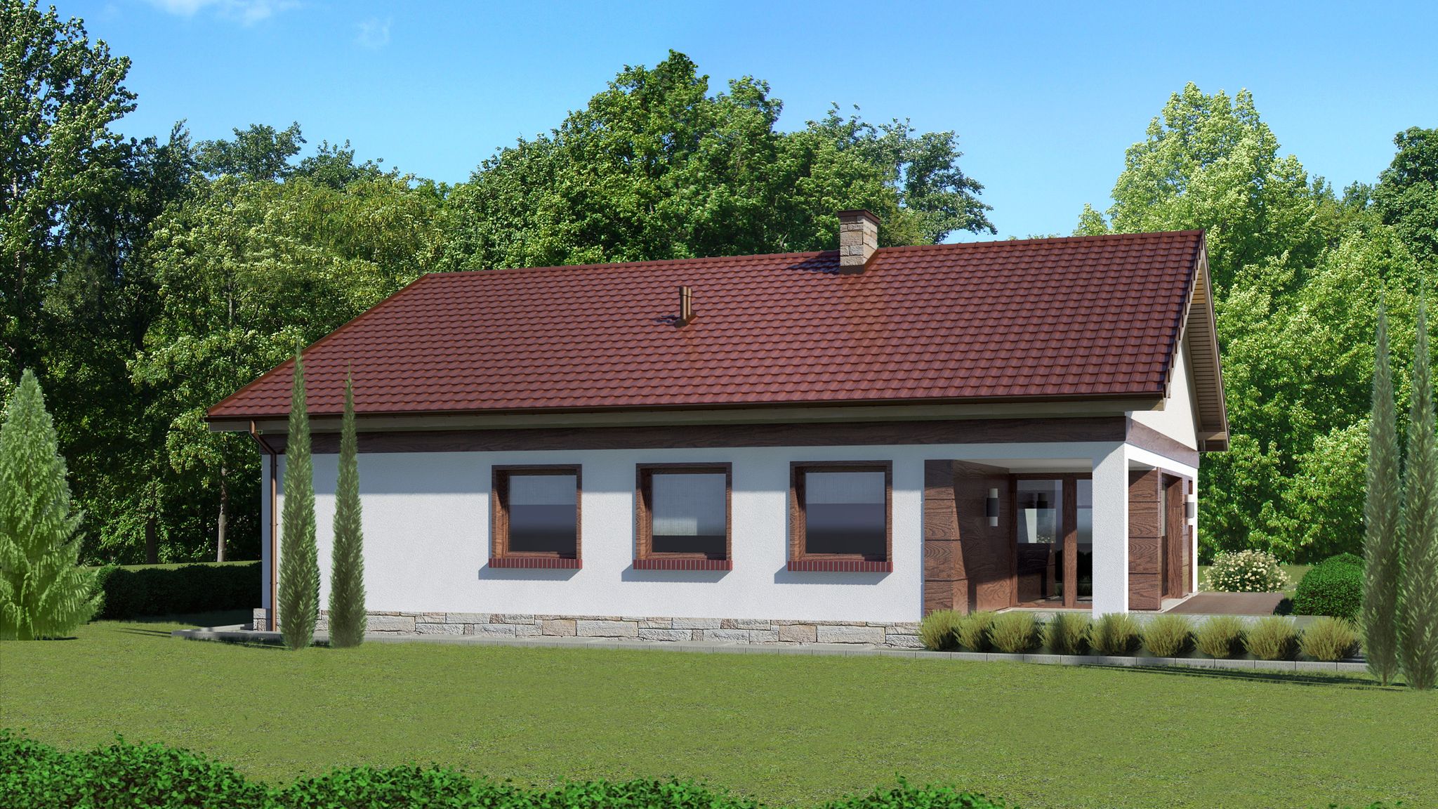 Graficzne opracowanie rzutów poglądowych widocznych na karcie projektu zostało wykonane przez Extradom.pl. Prezentowane przez Extradom.pl wizualizacje wykonane zostały przez autora projektu i należy poczytywać je jedynie za przykład i propozycję wykończenia, wizję architektoniczną autora projektu. Ostateczne wykończenie budynku może nastąpić na wiele sposobów. Szczegółowe rozwiązania zastosowane w oferowanej dokumentacji - w tym również ilość, lokalizacje i wygląd okien, drzwi, kominów - mogą w niewielkim stopniu różnić się od prezentowanej wizualizacji budynku.