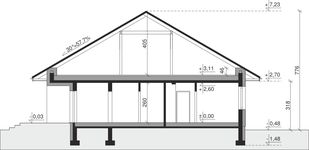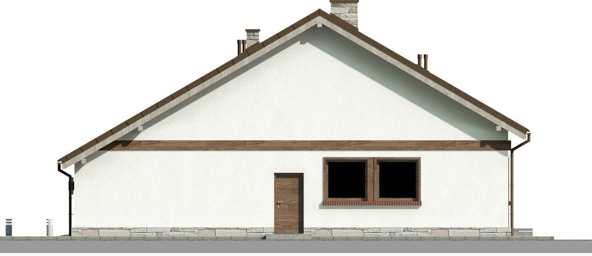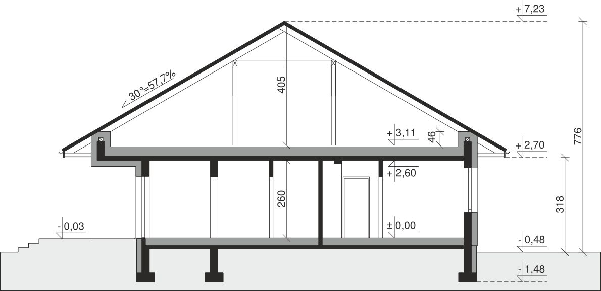 Ściany zewnętrzne: pustak 25 cm, styropian 20 cm. Ściany nośne: pustak 25 cm. Strop: monolityczny żelbetowy. Dach: kąt nachylenia 25°, pokrycie - dachówka ceramiczna lub betonowa.