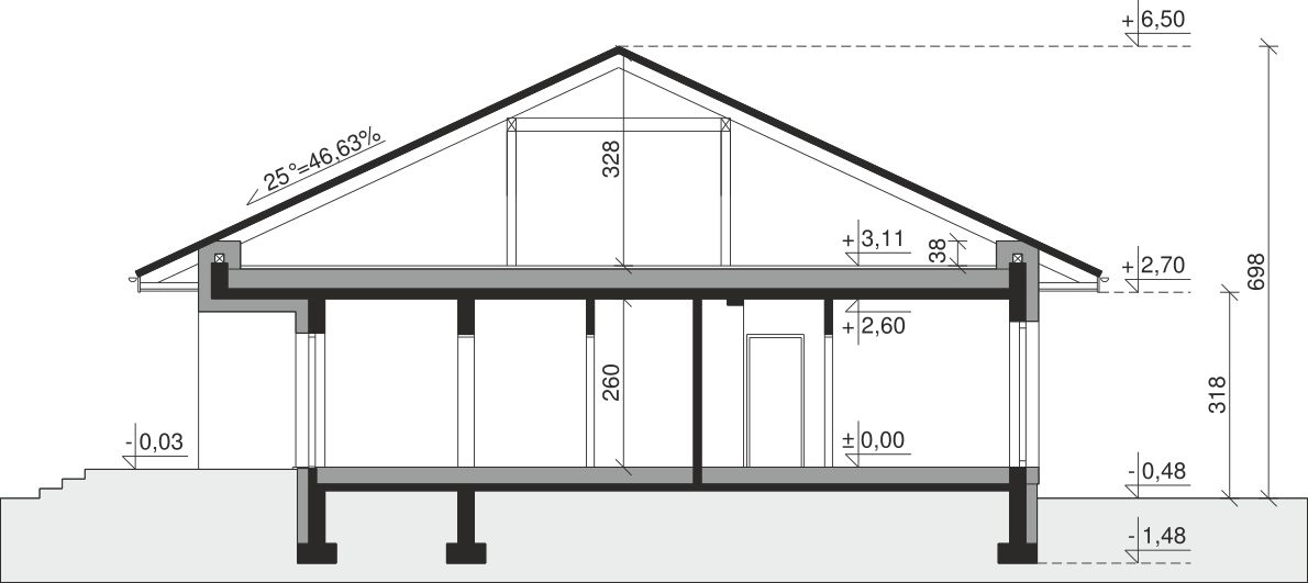 Ściany zewnętrzne: pustak 25 cm, styropian 20 cm. Ściany nośne: pustak 25 cm. Strop: monolityczny żelbetowy. Dach: kąt nachylenia 25°, pokrycie - dachówka ceramiczna lub betonowa. Instalacja solarna.