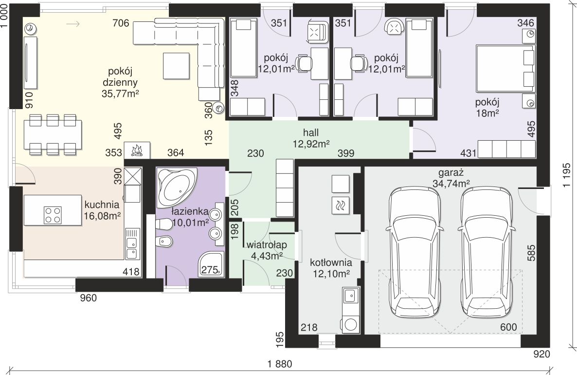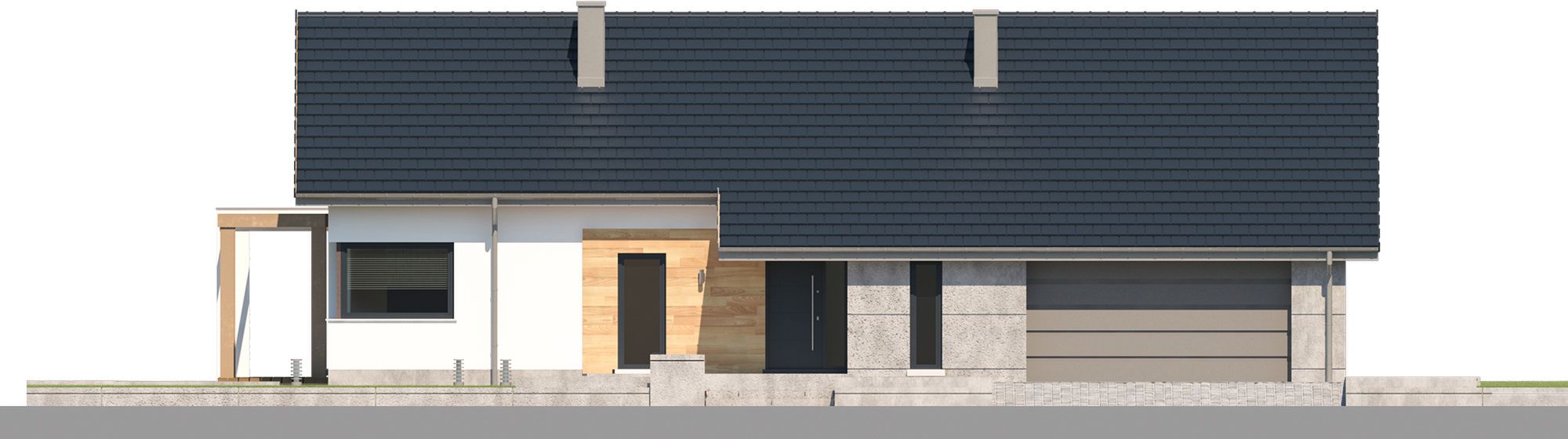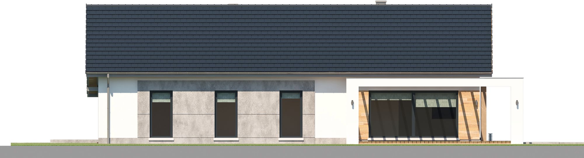 Graficzne opracowanie rzutów poglądowych widocznych na karcie projektu zostało wykonane przez Extradom.pl. Prezentowane przez Extradom.pl wizualizacje wykonane zostały przez autora projektu i należy poczytywać je jedynie za przykład i propozycję wykończenia, wizję architektoniczną autora projektu. Ostateczne wykończenie budynku może nastąpić na wiele sposobów. Szczegółowe rozwiązania zastosowane w oferowanej dokumentacji - w tym również ilość, lokalizacje i wygląd okien, drzwi, kominów - mogą w niewielkim stopniu różnić się od prezentowanej wizualizacji budynku.
