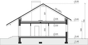 Ściany zewnętrzne: pustak 25 cm, styropian 20 cm. Ściany nośne: pustak 25 cm. Strop: monolityczny żelbetowy. Dach: kąt nachylenia 30°, pokrycie - dachówka ceramiczna lub betonowa. Instalacja solarna.