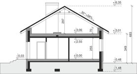 Ściany zewnętrzne: pustak 25 cm, styropian 20 cm. Ściany nośne: pustak 25 cm. Strop: monolityczny żelbetowy. Dach: kąt nachylenia 30°, pokrycie - dachówka ceramiczna lub betonowa. Instalacja solarna.