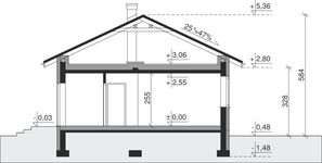Ściany zewnętrzne: pustak 25 cm, styropian 20 cm. Ściany nośne: pustak 25 cm. Strop: monolityczny żelbetowy. Dach: kąt nachylenia 25°, pokrycie - dachówka ceramiczna lub betonowa. Instalacja solarna.