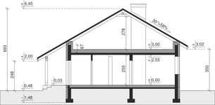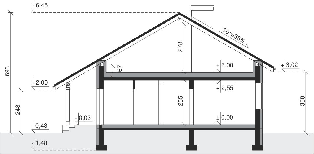 Ściany zewnętrzne: pustak 25 cm, styropian 15 cm. Ściany nośne: pustak 25 cm. Strop: monolityczny żelbetowy. Dach: kąt nachylenia 30°, pokrycie - dachówka ceramiczna lub betonowa.