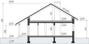 Ściany zewnętrzne: pustak 25 cm, styropian 20 cm. Ściany nośne: pustak 25 cm. Strop: monolityczny żelbetowy. Dach: kąt nachylenia 30°, pokrycie - dachówka ceramiczna lub betonowa. Instalacja solarna.