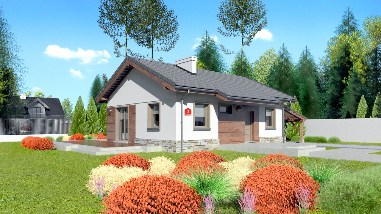 Graficzne opracowanie rzutów poglądowych widocznych na karcie projektu zostało wykonane przez Extradom.pl. Prezentowane przez Extradom.pl wizualizacje wykonane zostały przez autora projektu i należy poczytywać je jedynie za przykład i propozycję wykończenia, wizję architektoniczną autora projektu. Ostateczne wykończenie budynku może nastąpić na wiele sposobów. Szczegółowe rozwiązania zastosowane w oferowanej dokumentacji - w tym również ilość, lokalizacje i wygląd okien, drzwi, kominów - mogą w niewielkim stopniu różnić się od prezentowanej wizualizacji budynku.