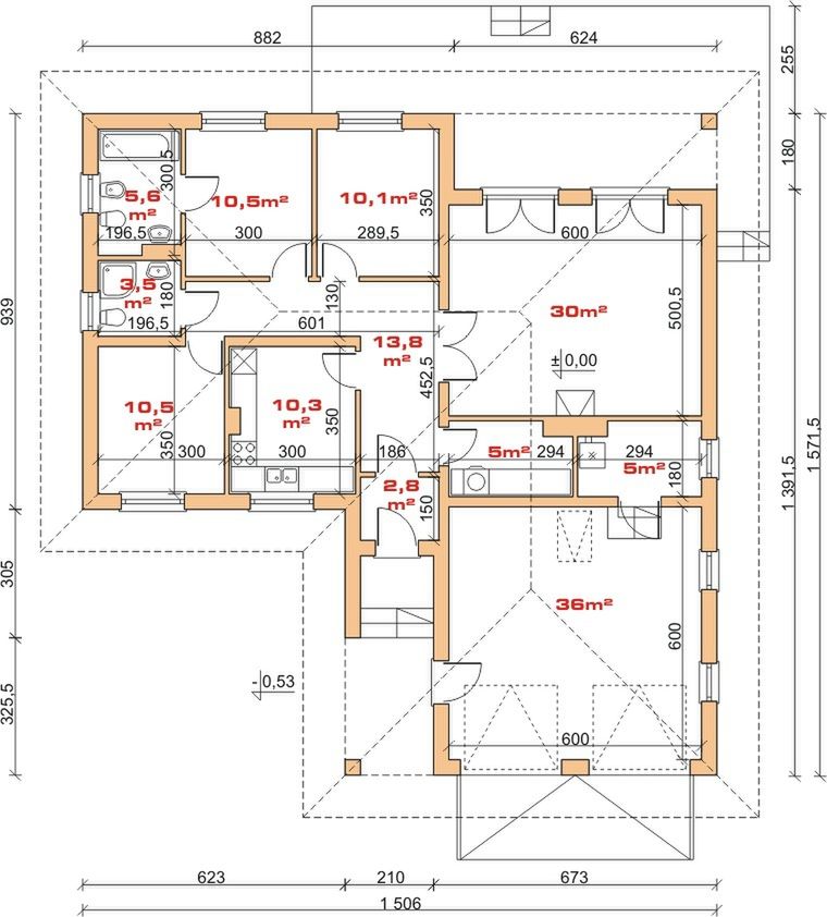 Ściany: bloczki betonu komórkowego 36,5 cm. Ściany nośne: bloczki betonu komórkowego 24 cm. Strop: monolityczny żelbetowy. Pokrycie dachu: dachówka ceramiczna lub betonowa.