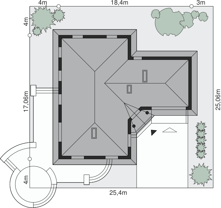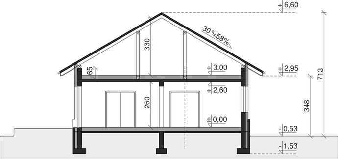 Ściany zewnętrzne: pustak 25 cm, styropian 15 cm. Ściany nośne: pustak 25 cm. Strop: monolityczny żelbetowy. Dach: kąt nachylenia 30°, pokrycie - dachówka ceramiczna lub betonowa.