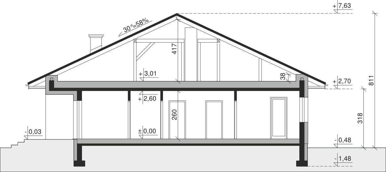 Ściany zewnętrzne: pustak 25 cm, styropian 20 cm. Ściany nośne: pustak 25 cm. Strop: monolityczny żelbetowy. Dach: kąt nachylenia 30°, pokrycie - dachówka ceramiczna lub betonowa. Instalacja solarna.