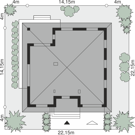 Ściany zewnętrzne: pustak 25 cm, styropian 20 cm. Ściany nośne: pustak 25 cm. Strop: monolityczny żelbetowy. Dach: kąt nachylenia 25°, pokrycie - dachówka ceramiczna lub betonowa. Instalacja solarna.