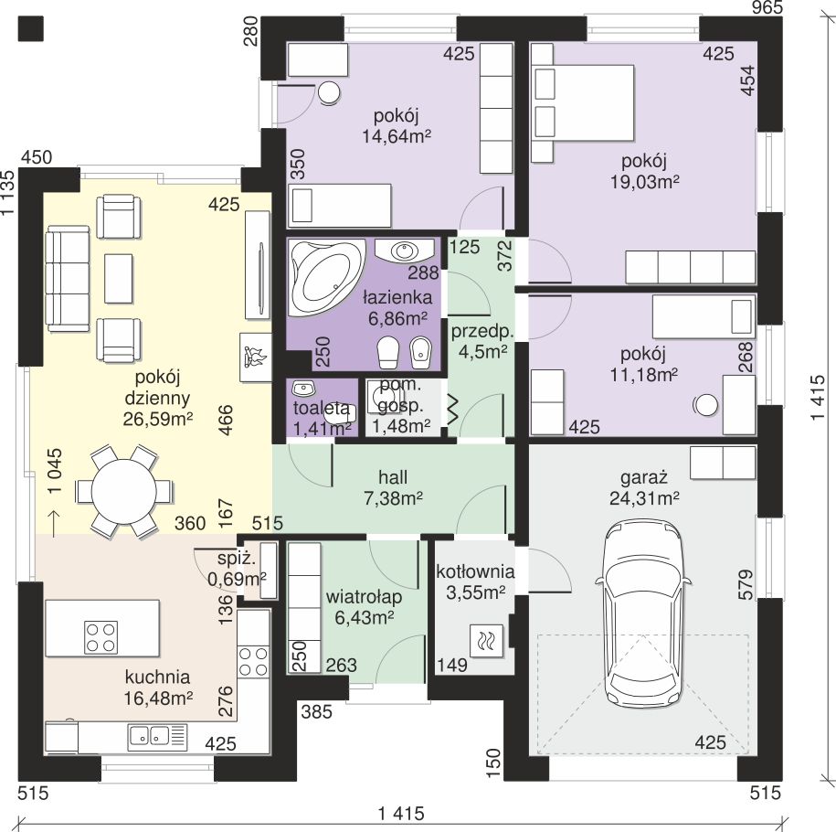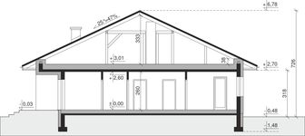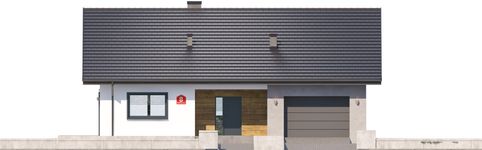 Graficzne opracowanie rzutów poglądowych widocznych na karcie projektu zostało wykonane przez Extradom.pl. Prezentowane przez Extradom.pl wizualizacje wykonane zostały przez autora projektu i należy poczytywać je jedynie za przykład i propozycję wykończenia, wizję architektoniczną autora projektu. Ostateczne wykończenie budynku może nastąpić na wiele sposobów. Szczegółowe rozwiązania zastosowane w oferowanej dokumentacji - w tym również ilość, lokalizacje i wygląd okien, drzwi, kominów - mogą w niewielkim stopniu różnić się od prezentowanej wizualizacji budynku.