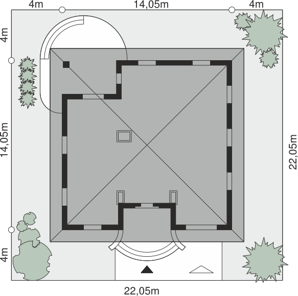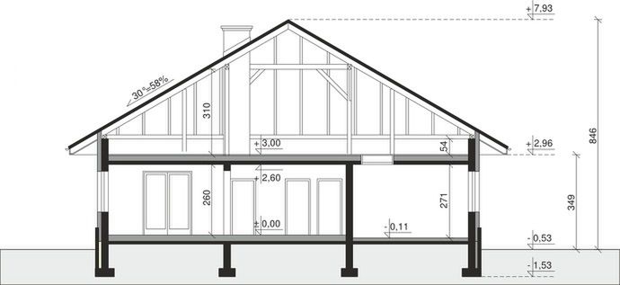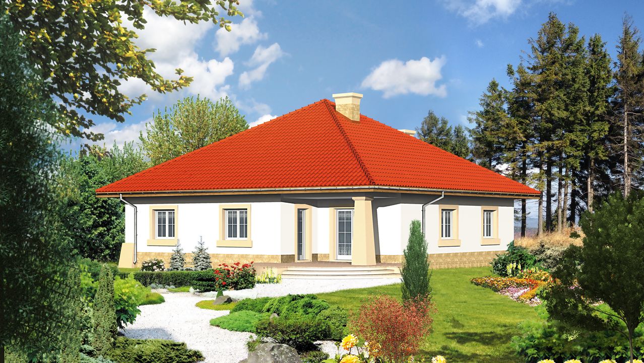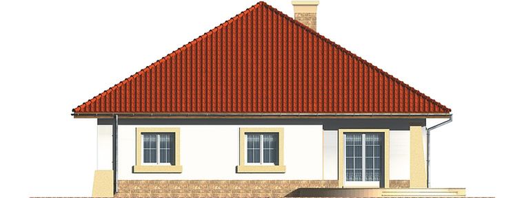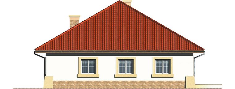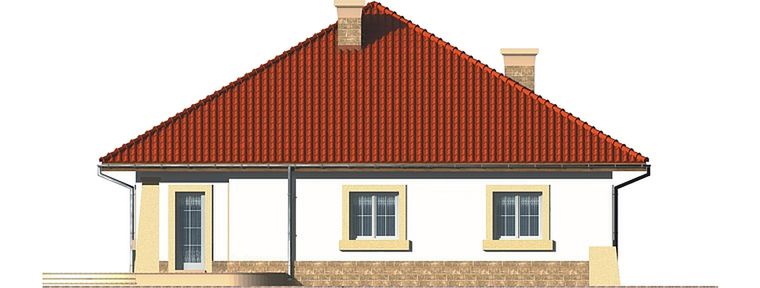 Ściany zewnętrzne: pustak 25 cm, styropian 15 cm. Ściany nośne: pustak 25 cm. Strop: monolityczny żelbetowy. Dach: kąt nachylenia 30°, pokrycie - dachówka ceramiczna lub betonowa.