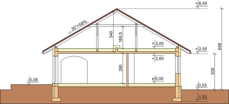 Ściany: pustak ceramiczny 29 cm, styropian 15 cm. Ściany nośne: pustak ceramiczny 19 cm. Strop: monolityczny żelbetowy. Pokrycie dachu: dachówka.
