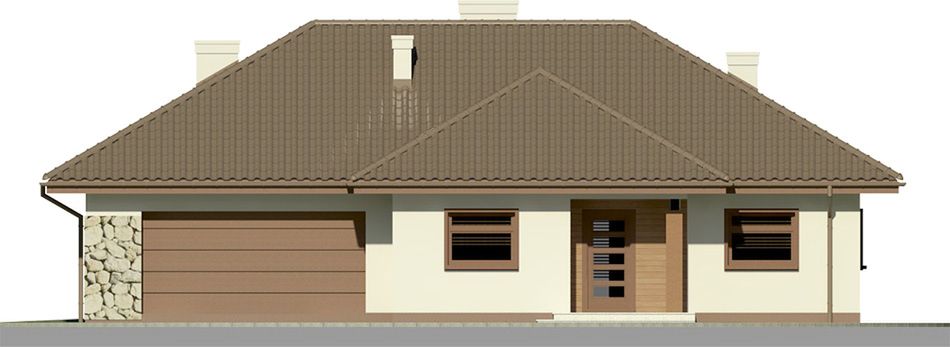 Ściany zewnętrzne: pustak 25 cm, styropian 15 cm. Ściany nośne: pustak 25 cm. Strop: monolityczny żelbetowy. Dach: kąt nachylenia 30°, pokrycie - dachówka ceramiczna lub betonowa.