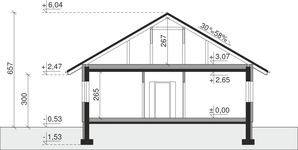 Ściany zewnętrzne: pustak 30 cm, styropian 20 cm. Ściany nośne: pustak 25 cm. Strop: monolityczny żelbetowy. Dach: kąt nachylenia 30°, pokrycie - dachówka ceramiczna lub betonowa. Instalacja solarna.