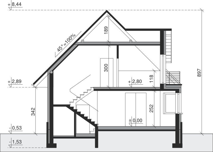 Ściany zewnętrzne: pustak 25 cm, styropian 20 cm. Ściany nośne: pustak 25 cm. Strop: monolityczny żelbetowy. Dach: kąt nachylenia 45°, pokrycie - dachówka ceramiczna lub betonowa. Instalacja solarna.