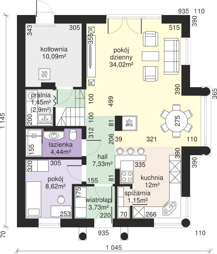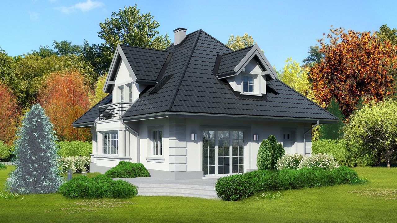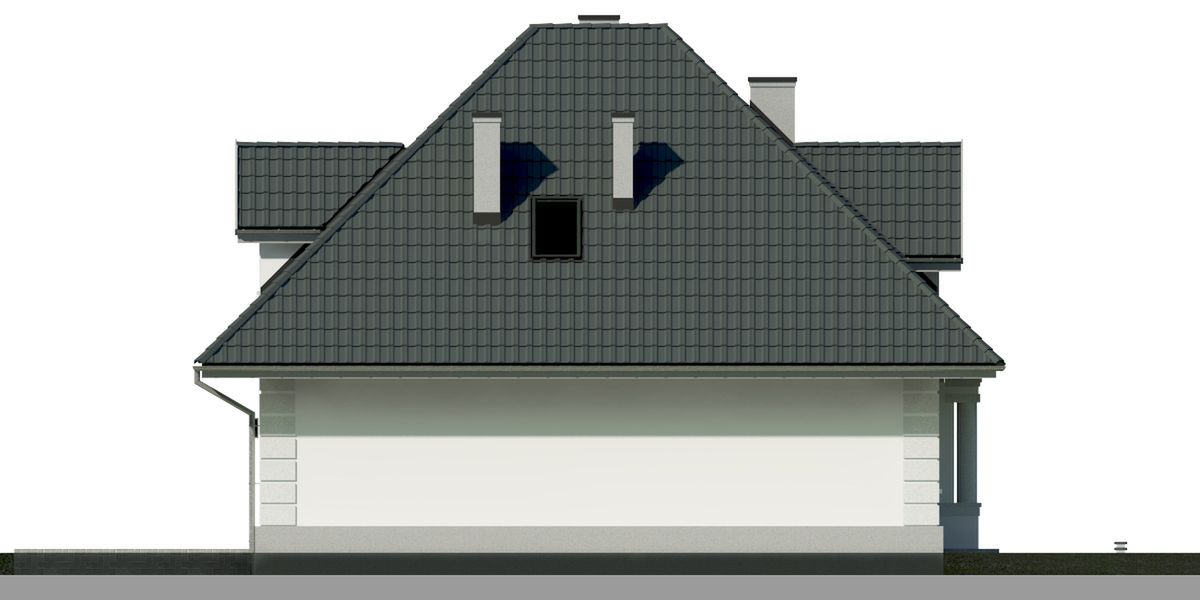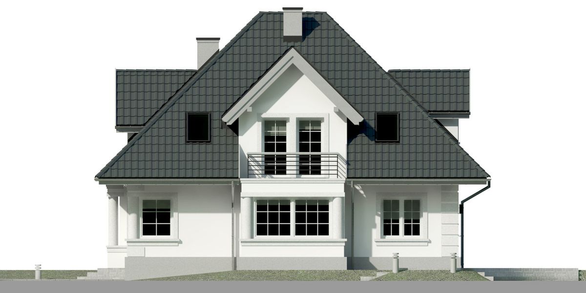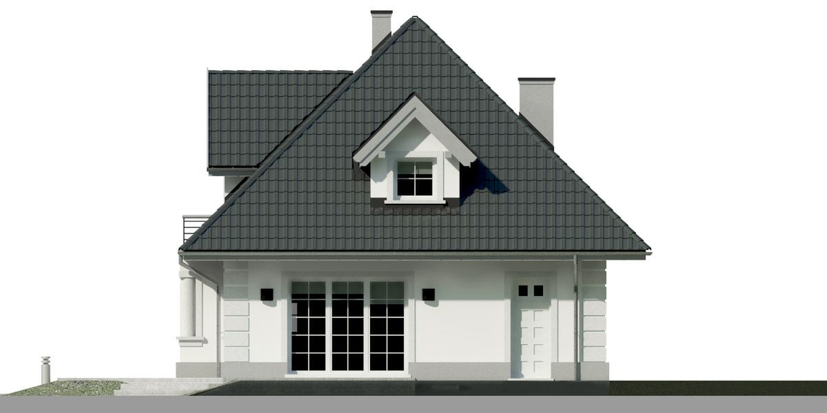 Graficzne opracowanie rzutów poglądowych widocznych na karcie projektu zostało wykonane przez Extradom.pl. Prezentowane przez Extradom.pl wizualizacje wykonane zostały przez autora projektu i należy poczytywać je jedynie za przykład i propozycję wykończenia, wizję architektoniczną autora projektu. Ostateczne wykończenie budynku może nastąpić na wiele sposobów. Szczegółowe rozwiązania zastosowane w oferowanej dokumentacji - w tym również ilość, lokalizacje i wygląd okien, drzwi, kominów - mogą w niewielkim stopniu różnić się od prezentowanej wizualizacji budynku.