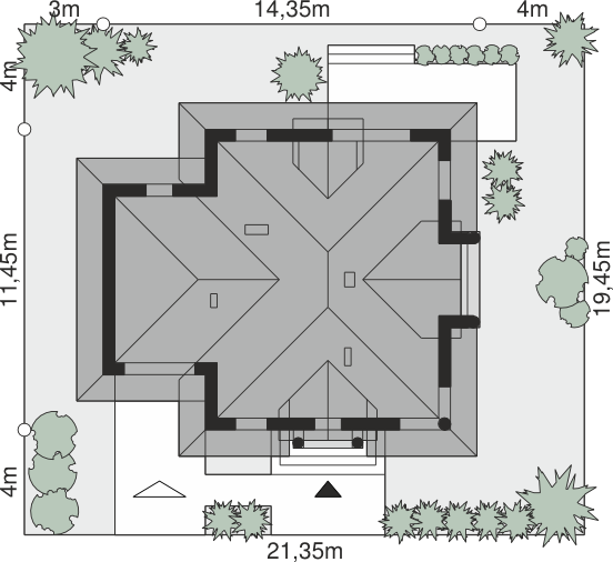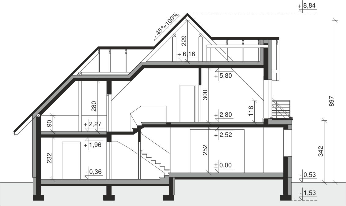 Ściany zewnętrzne: pustak 25 cm, styropian 20 cm. Ściany nośne: pustak 25 cm. Strop: monolityczny żelbetowy. Dach: kąt nachylenia 45°, pokrycie - dachówka ceramiczna lub betonowa. Instalacja solarna.
