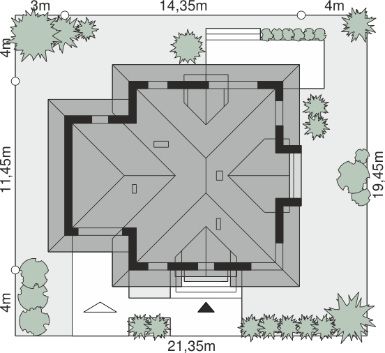 Ściany zewnętrzne: pustak 25 cm, styropian 20 cm. Ściany nośne: pustak 25 cm. Strop: monolityczny żelbetowy. Dach: kąt nachylenia 45°, pokrycie - dachówka ceramiczna lub betonowa. Instalacja solarna.
