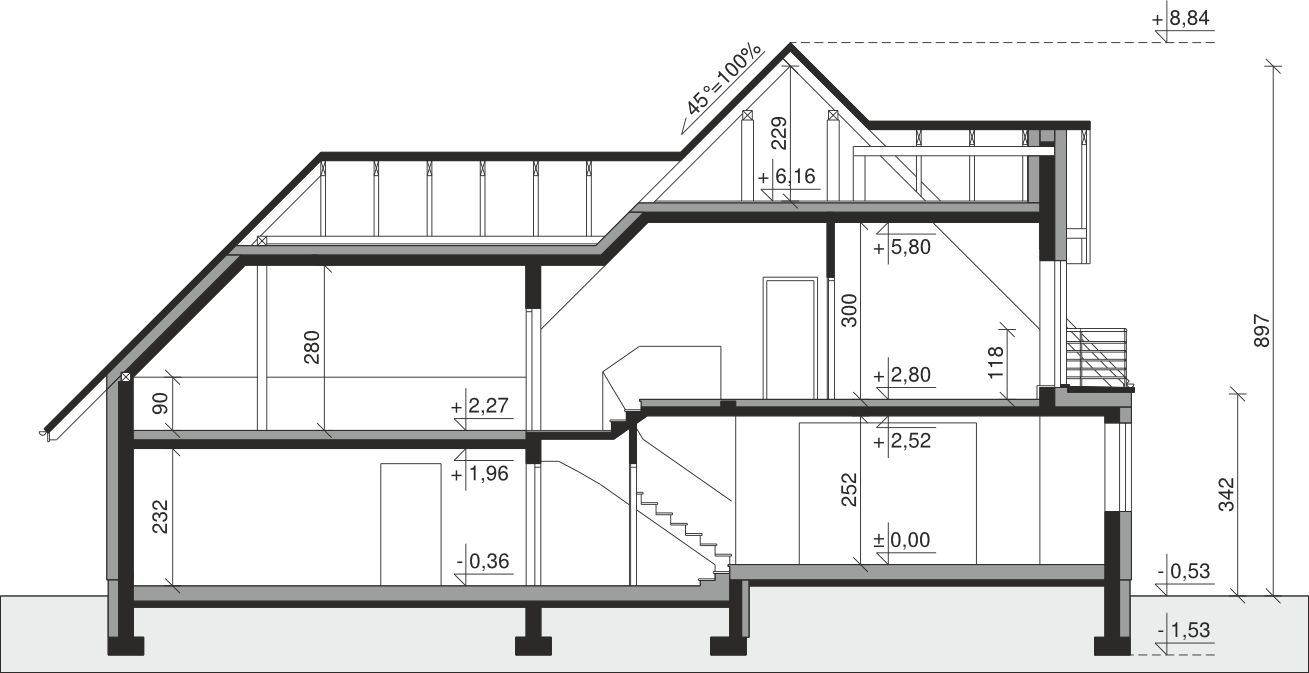 Ściany zewnętrzne: pustak 25 cm, styropian 20 cm. Ściany nośne: pustak 25 cm. Strop: monolityczny żelbetowy. Dach: kąt nachylenia 45°, pokrycie - dachówka ceramiczna lub betonowa. Instalacja solarna.