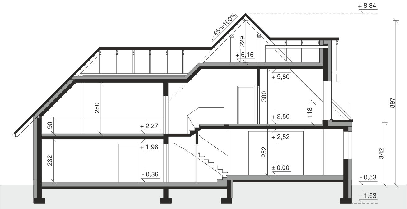 Ściany zewnętrzne: pustak 25 cm, styropian 20 cm. Ściany nośne: pustak 25 cm. Strop: monolityczny żelbetowy. Dach: kąt nachylenia 45°, pokrycie - dachówka ceramiczna lub betonowa. Instalacja solarna.